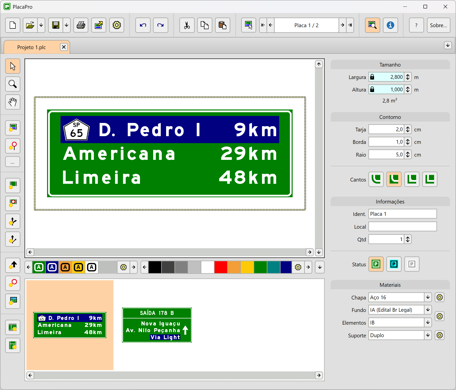 Você pode criar placas complexas com apenas alguns cliques de mouse. O programa calcula as dimensões automaticamente, de acordo com as normas de sinalização (DER SP, CONTRAN, Guia Brasileiro de Sinalização Turística).